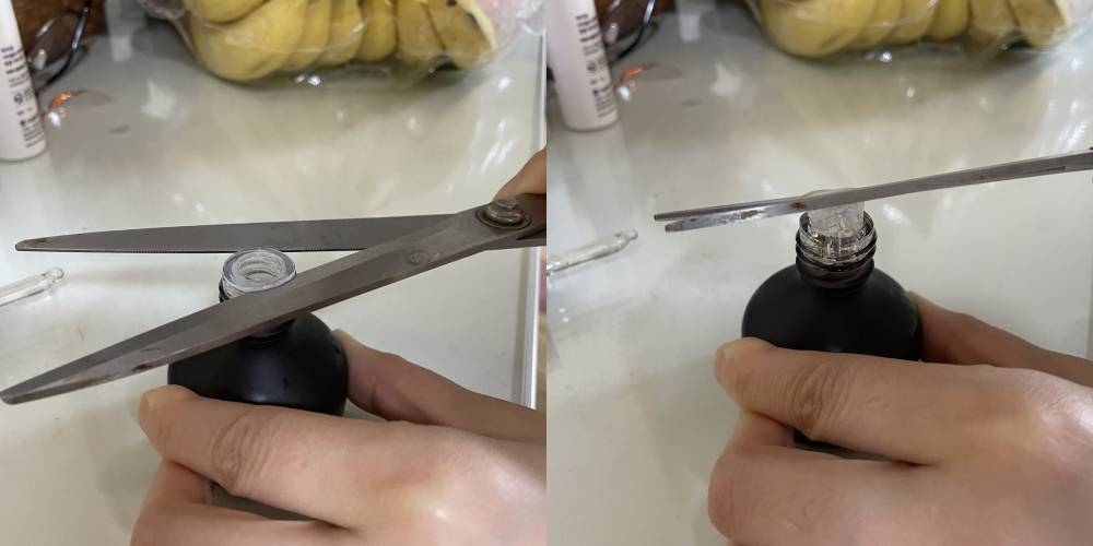 - 앰플의 플라스틱 마개와 병 사이 경계 부분에 가위를 대고, 천천히 힘을 주어 들어올려 주세요.